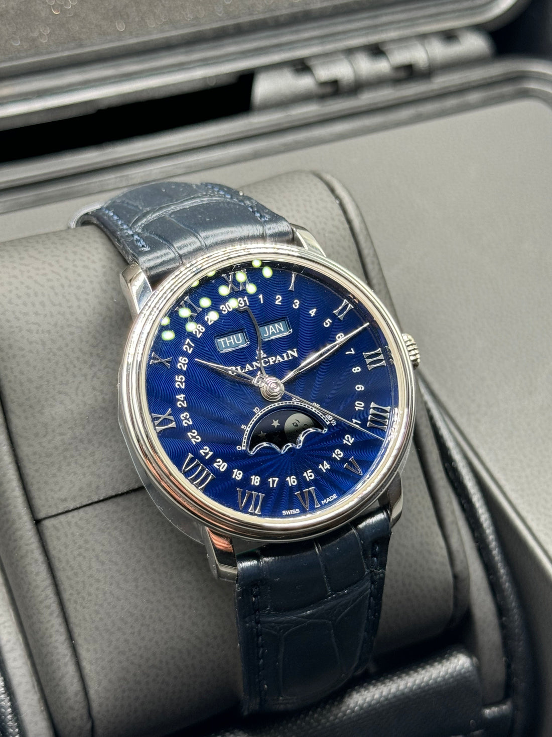 Blancpain Villeret Quantieme Complet White Gold Blue Alligator Men's Watch - 6654 1529 55B