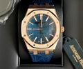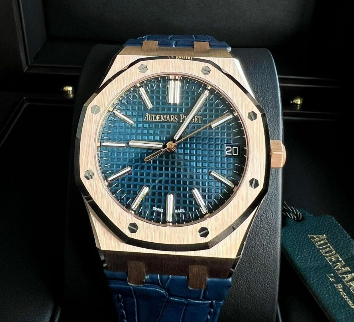 Blue dial with “Grande Tapisserie” pattern, pink gold applied hour-markers and Royal Oak hands with luminescent coating.