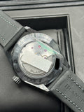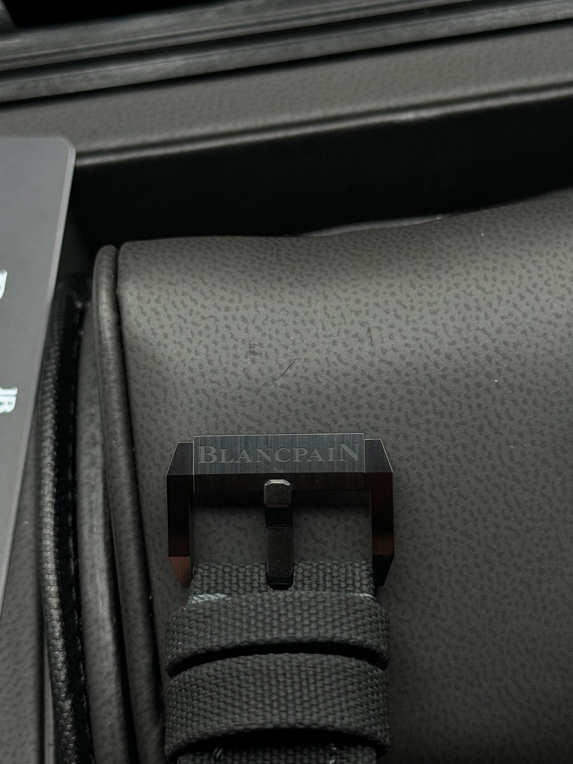 This watch features: Brushed black ceramic case. Uni-Directional Bezel: Brushed black ceramic bezel casing. Black polished ceramic fill. Bezel graduating indication made of Liquidmetal. Ink black dial with a very fine sun-ray finish Applied polished steel index & dot hour markers with luminous fill. Polished steel bold squared hour & minute hands with luminescent fill. Polished steel central seconds hand with luminous dot and red tip. Date window displayed between the 4 and 5 o’clock positions. Blancpain Caliber 1315, beats at 28,800 vph, composed out of 227 parts, contains 35 Jewels & has an approximate power reserve of 120 hours. The movement is fitted with a nonmagnetic silicon balance-spring – in-additional to its non-magnetic properties, silicon is also extremely corrosion-resistant, resistant to wear and natural aging.