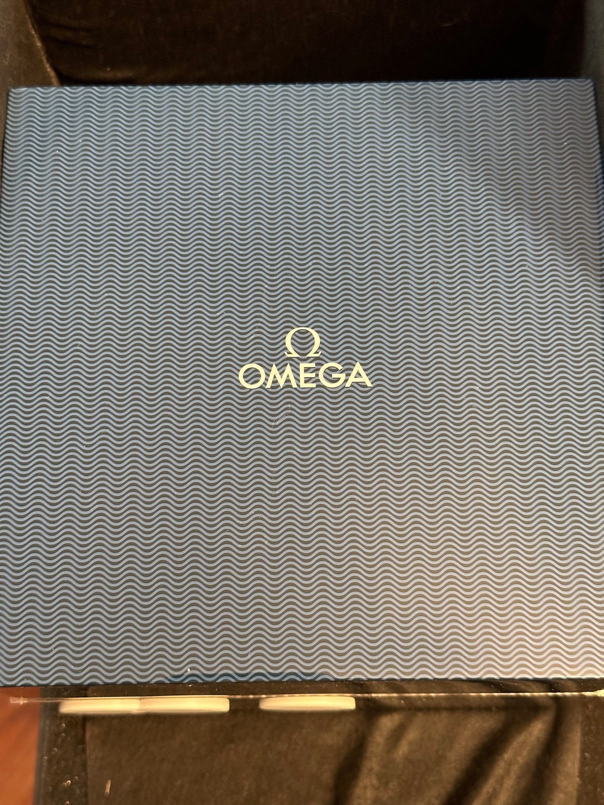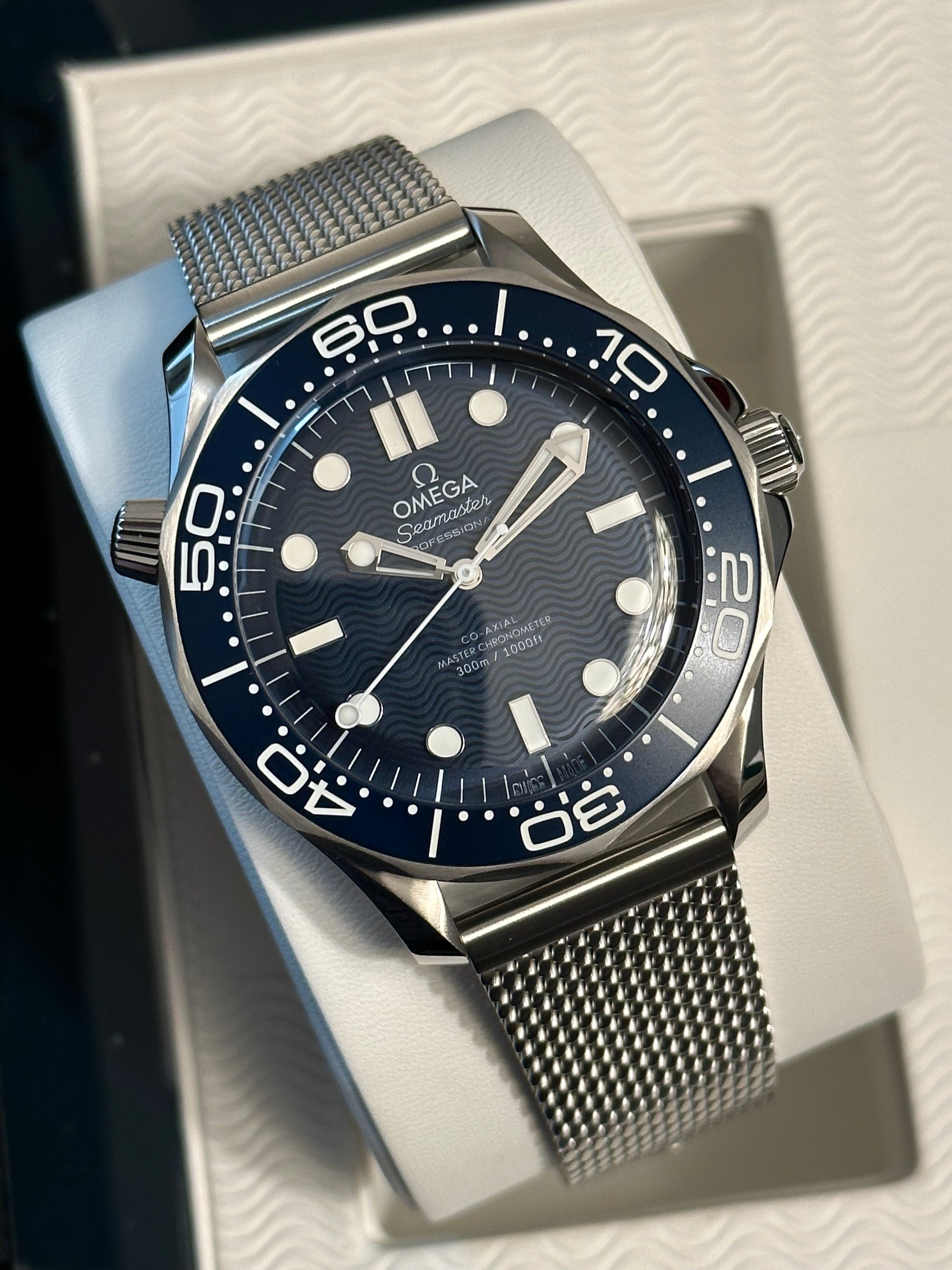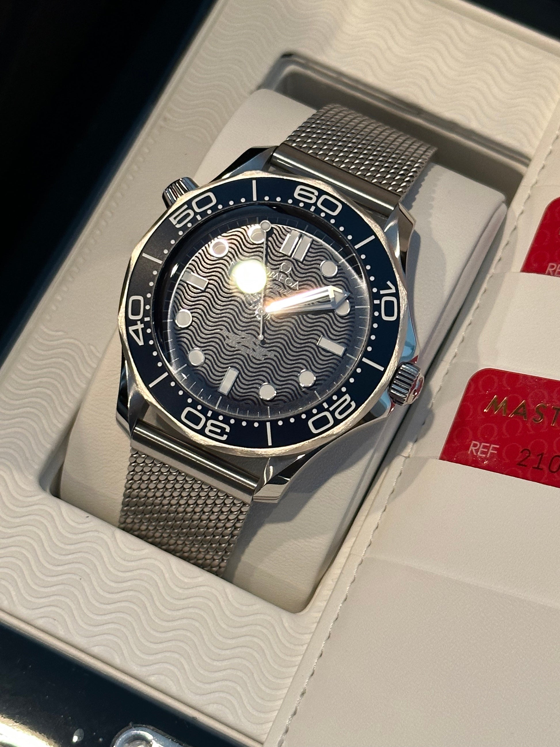 The watch is presented in a blue wooden box decorated in the original Diver 300M pattern, with three dots inspired by the classic Bond movie opening sequence, including a secret push button on the right.