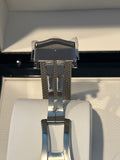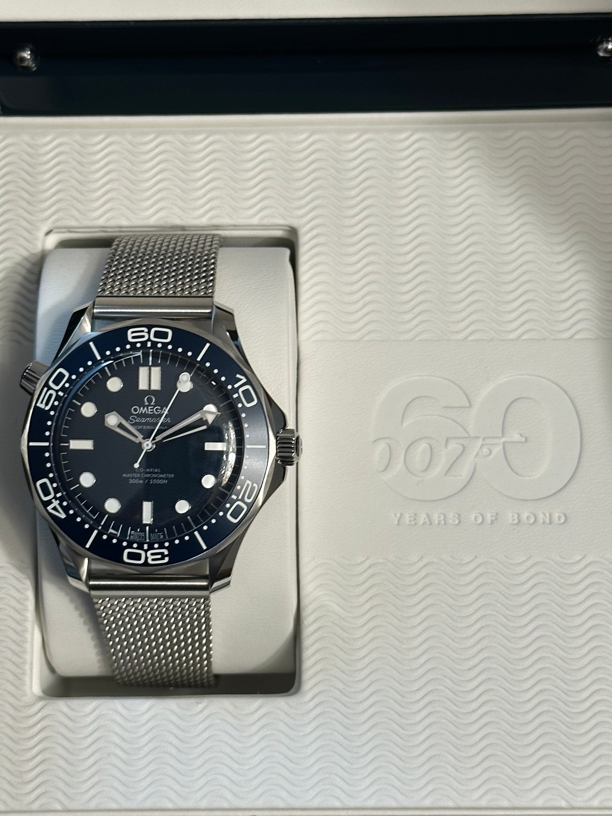 Launched in 2022, to celebrate 60 years of James Bond, this 42mm Seamaster Diver 300M in stainless steel, has a blue oxalic anodized aluminium dial, with laser engraved waves, inspired by the Seamaster Diver 300M worn by James Bond in 1995’s GoldenEye. A commemorative 60 replaces the diving scale’s traditional inverted triangle.