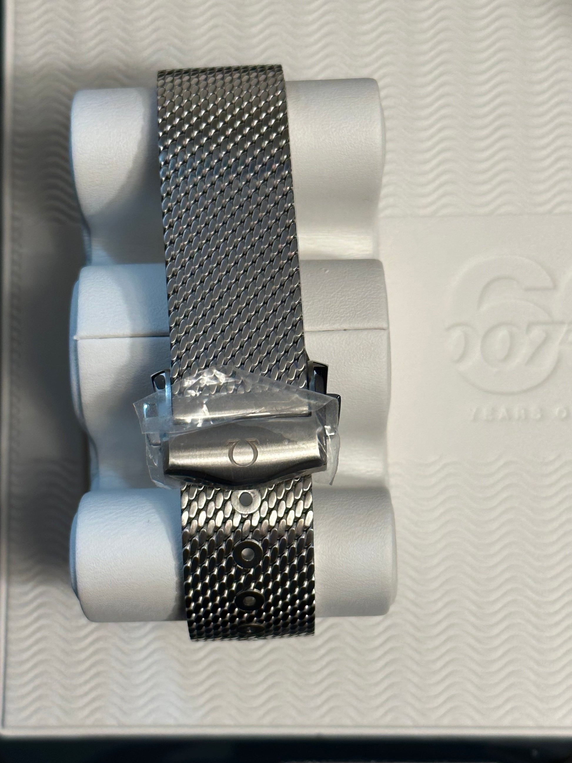 Adding texture to the metallic look is a brushed stainless steel bracelet, in the same elegant mesh style as Bond’s titanium watch in No Time To Die.