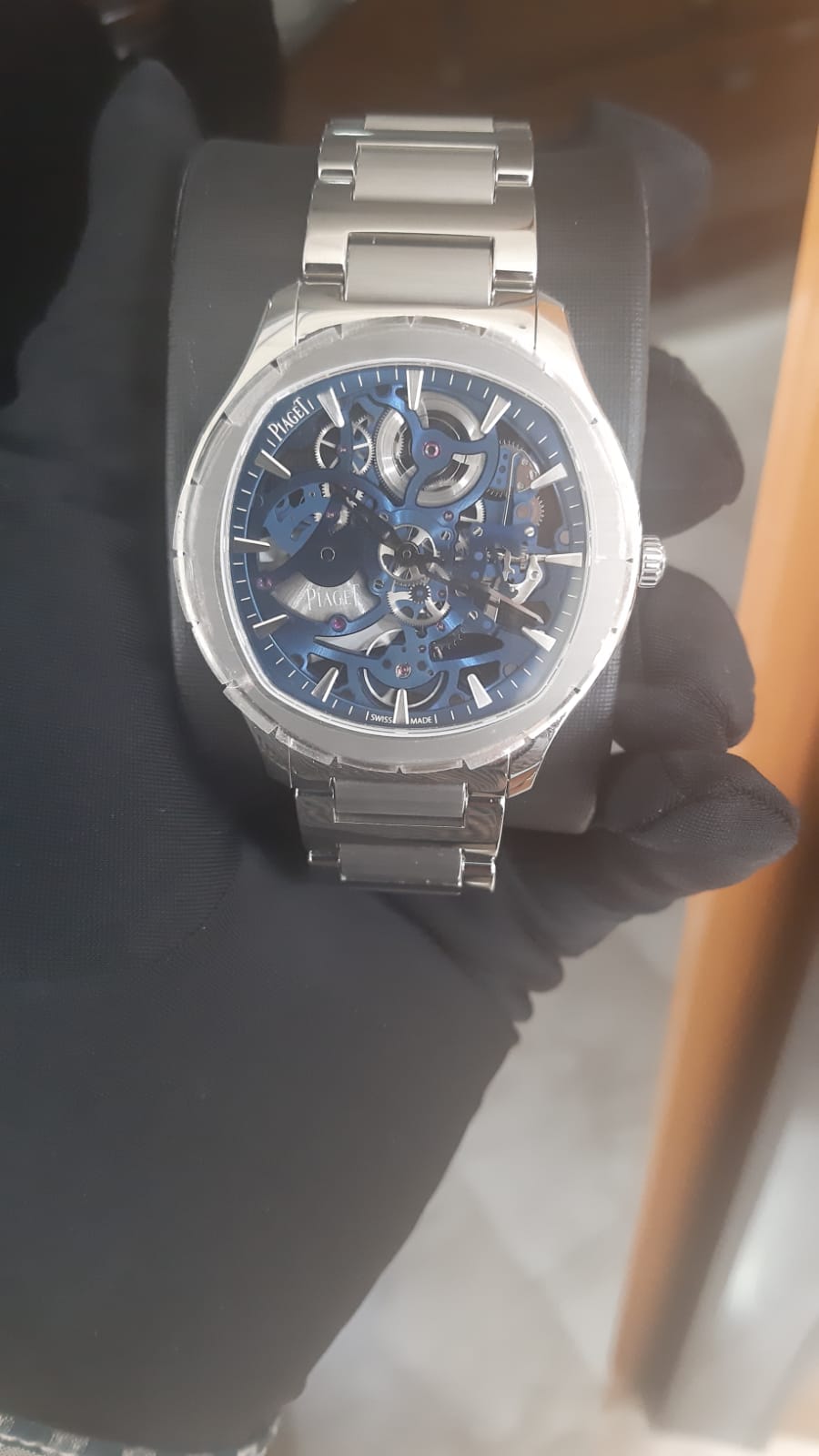Piaget Polo watch with an ultra-thin skeleton 1200S1 movement in a sporty steel case. Technical excellence becomes an open show of Piaget watchmaking mastery in this skeleton watch that allows the wearer to see the movements work. A luxury steel watch with an ultra-thin skeleton movement for a modern take on an iconic watch. The blue movement is divided by applied hour-markers displaying hours, minutes and seconds. The sapphire glass and case back reveal the refined finishing of the movement. A sleek luxury watch pulsating with vibrant energy, a versatile timepiece including two interchangeable straps that can be swapped effortlessly: a polished and satin-brushed steel bracelet for a sporty finish or a refined leather bracelet that perfectly complements the ultra-thin curved case.