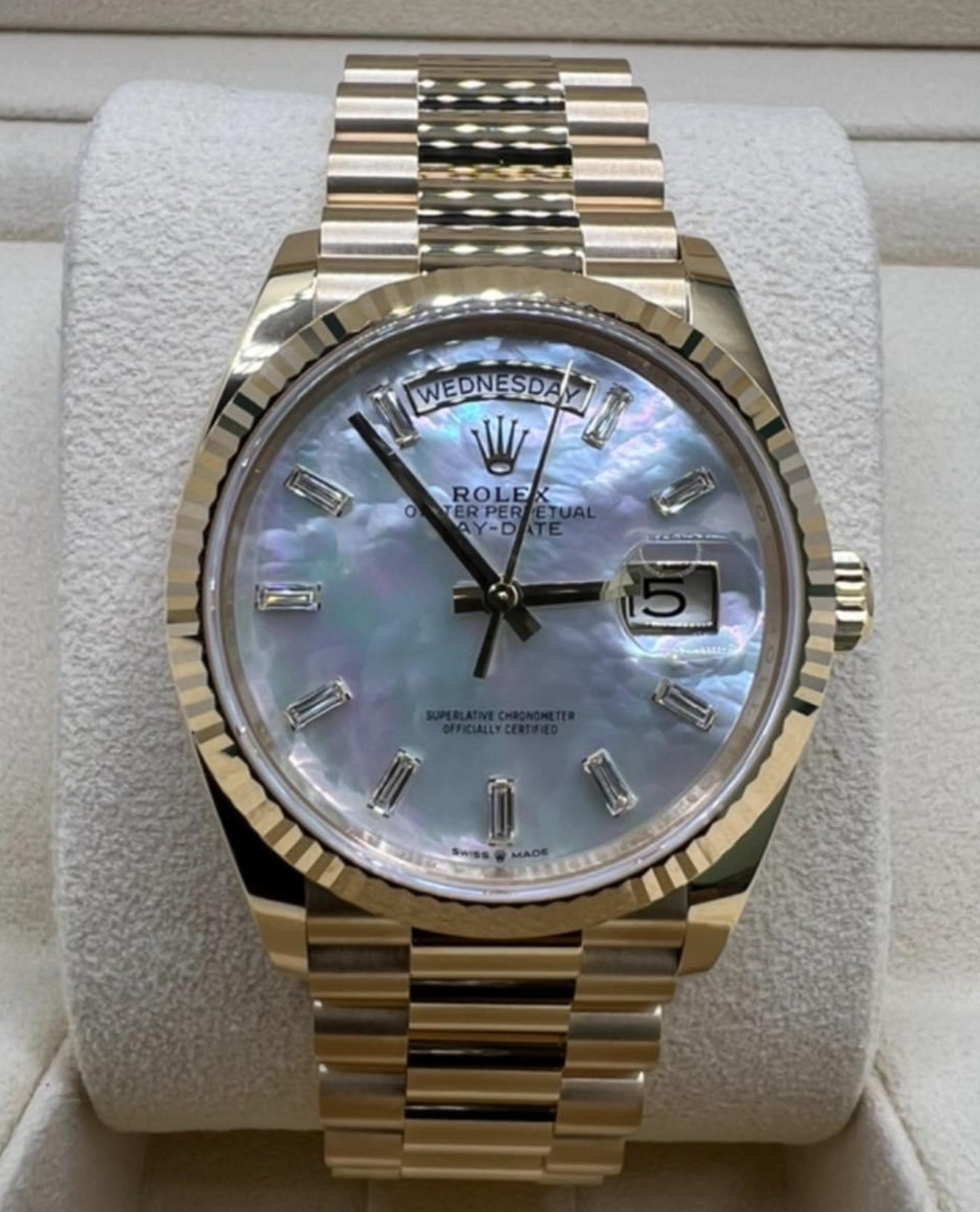 Rolex Day-Date 36 36mm White MOP Diamond-Set Dial Fluted Bezel President Bracelet - 128238 | 2024 Model