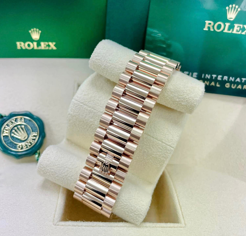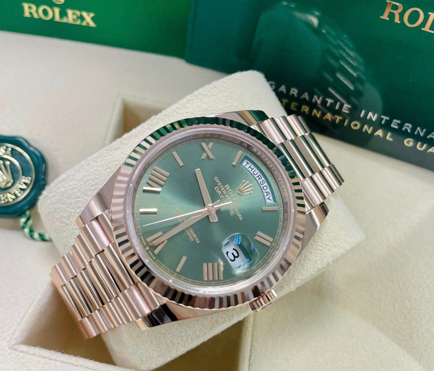40mm 18K Everose gold case, screw-down back with Rolex fluting, screw-down crown with twinlock double waterproofness system, fluted bezel, scratch-resistant double anti-reflective sapphire crystal with cyclops lens over the date, olive green dial, bevelled deconstructed Roman numerals, Rolex calibre 3255 automatic movement with centre hour, minute and seconds hands, instantaneous day and date in apertures, unrestricted rapid-setting, and stop-seconds for precise time setting, approximately 70 hours of power reserve, President bracelet with three-piece solid links comprised of a polished center link, satin-finished outer links, and ceramic inserts, concealed folding Crownclasp buckle. Waterproof to 100 meters.