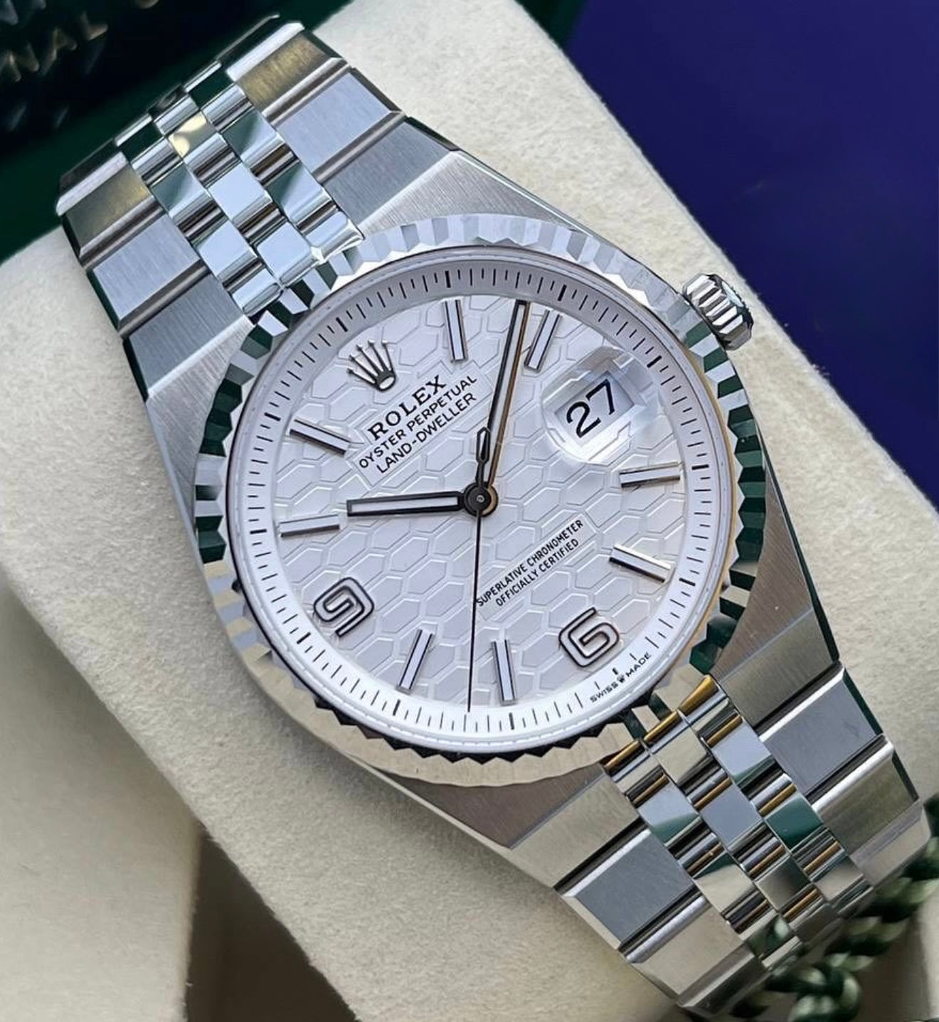 Rolex Land-Dweller 36 White Gold Oystersteel Intense White Honeycomb Motif Dial Fluted Bezel Flat Jubilee Bracelet 127234 - 2025