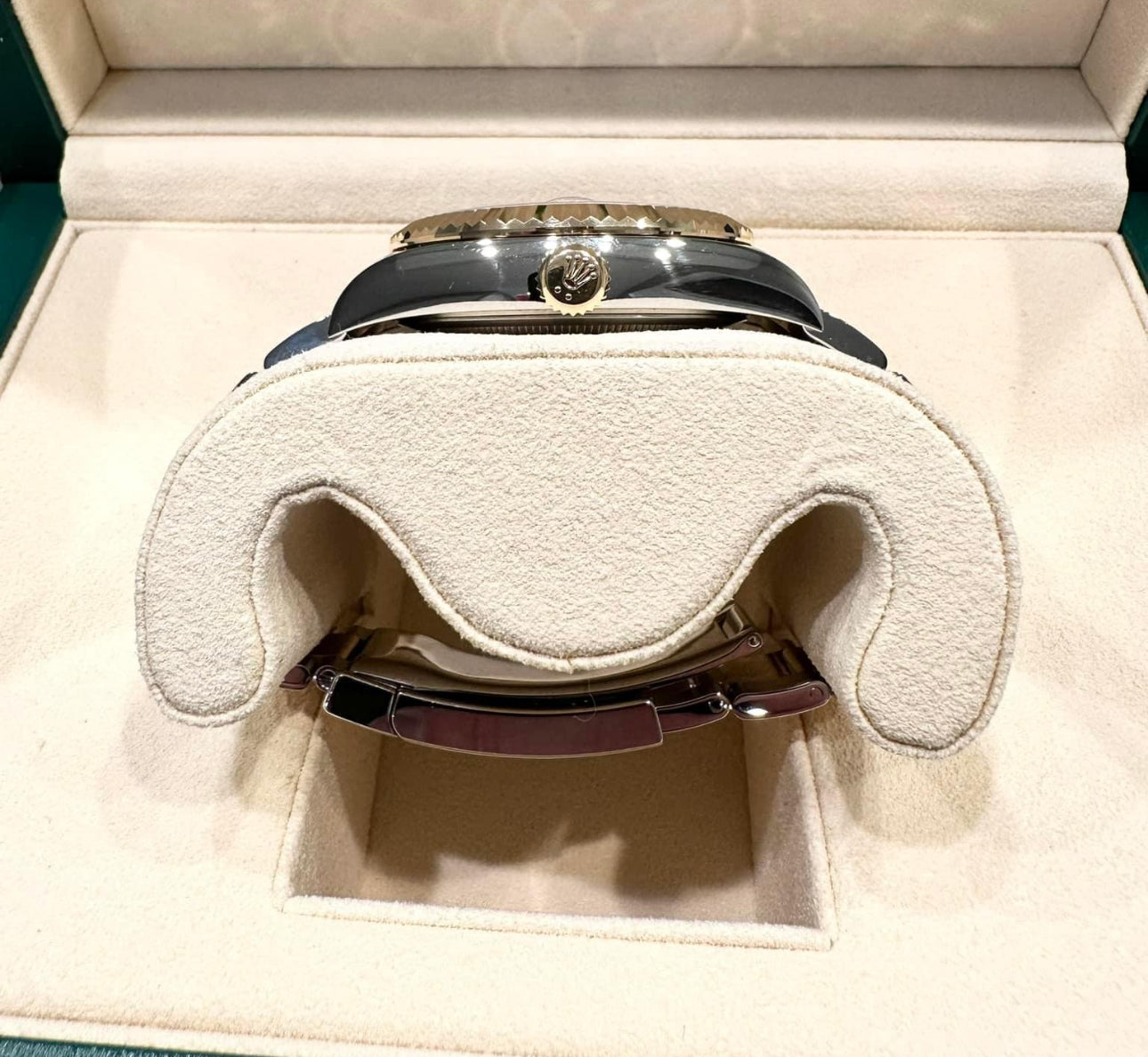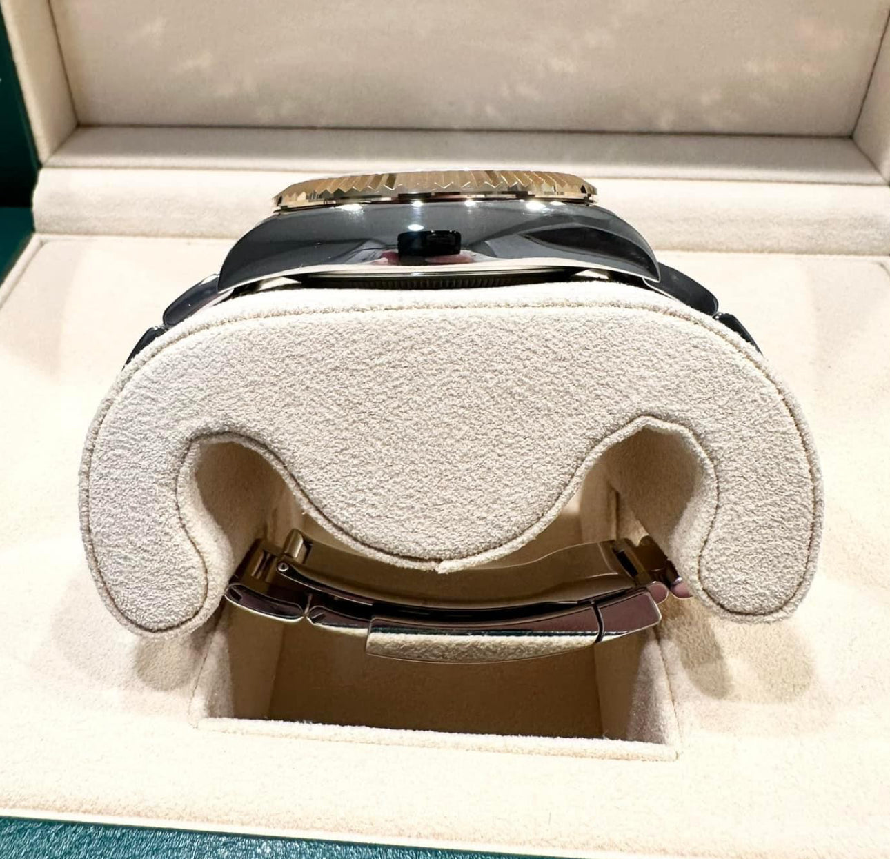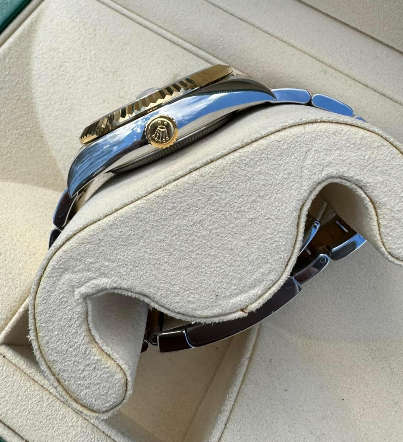 42mm yellow Rolesor case comprised of a 904L steel monobloc middle case, screw-down back, screw-down crown, 18K yellow gold fluted bezel with bidirectional rotatable Rolex Ring Command, scratch-resistant sapphire crystal with cyclops lens over the date and double anti-reflective coating, white dial, index hour markers, Rolex calibre 9001 automatic movement , second time-zone displayed via off-center rotating disc, Saros annual calendar with date at 3 o'clock and month indicated in discrete apertures at each of the 12 hour marks, stainless steel and 18K yellow gold Oyster bracelet, folding Oysterclasp buckle with Easylink 5mm comfort extension link. Waterproof to 100 meters.